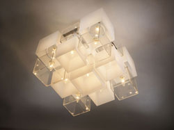 設(shè)計(jì)理念:這盞吊燈的設(shè)計(jì)概念源自立方體形態(tài),利用了兩種比例及高低的立方體組合而成。它的外形像古典吊燈,但卻用了亞加力膠來(lái)代替水晶。這會(huì)帶出一種較時(shí)尚與整齊的感覺(jué),亦會(huì)令別人對(duì)古典吊燈有一番新的觀感。