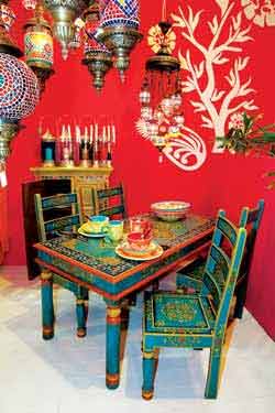 不管是吊燈上的花紋還是桌子上擺放的杯子及碗上的圖案,還是柜子上擱置的燭臺的造型,都傳遞著一種濃濃的異域風情,就連墻壁上的花紋和桌椅上的圖案都是如此。民族風情一直是近幾年家飾的一個流行趨勢,在這種趨勢指引下,具有濃郁區(qū)域特色的圖案、花紋被廣泛運用到家居飾品的飾面上。