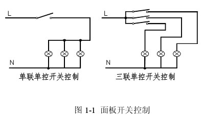 蹺板開關設置于門口,對于面積較大的房間燈具較多時,采用雙聯(lián)、三聯(lián)、四聯(lián)開關或多個開關,其原理接線圖見圖1-1。