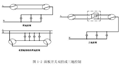 對于樓道和樓梯照明,多采用雙控方式(有的長樓道采用三地控制),在樓道和樓梯入口安裝雙控蹺板開關,其特點是在任意入口處都可以開閉照明裝置。其原理接線圖見圖1-2。
