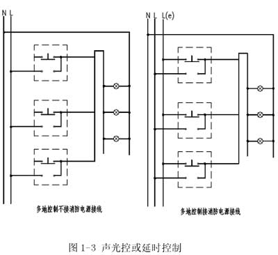 2. 定時開關或聲光控開關控制住宅樓、公寓樓樓梯間多采用定時開關或聲光控開關控制,其原理接線圖見圖1-3。