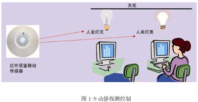 在一定場所或整個樓宇,根據(jù)人員走動情況進行開關燈的一種方式。見圖1-9。