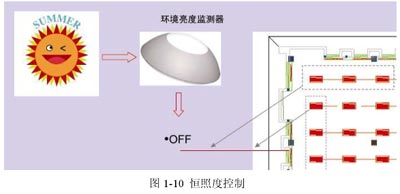 根據(jù)探頭探測到的照度來控制照明場所內(nèi)相關燈具的開啟或關閉,保持場所的照度恒定。見圖1-10。