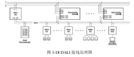安裝 DALI 接口有 2 條主電源線,二條控制線,對線材無特殊要求,安裝時也無極性要求,只要求主電源線與控制線隔離開,控制線無需屏蔽,要注意的是當控制線上電流在 250mA,線長 300 米時壓降不超過 2V。控制線和電源線可并行,無需另外敷線。設計緊湊的控制組件無需專門的控制柜,因此安裝簡便且經(jīng)濟。接線原理見圖1-18。