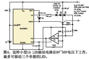 對(duì)于圖3中的單LED電路,MAX1685的起始電壓定義了最低為2.7V的輸入電壓范圍。圖1中電路和圖2中電路最大電流分別為0.5A和1A。最大極限工作電壓還是6.5V。電路一旦開(kāi)始運(yùn)行后,就向LED供電來(lái)輸入低達(dá)1.7V的電壓。圖1、2、3中電路的應(yīng)用包括頭燈,手電筒,及任何其它由三或四節(jié)堿性原電池、鎳氫/鎘鎳二次電池或單節(jié)鋰二次電池供電的便攜燈具。