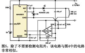 圖4和5中的電路在8V至50V的電壓下工作。假如有一個(gè)12V的系統(tǒng),其中所有的元件都確定了,由于IC輸入電源端子VIN有76V的絕對(duì)最大額定電壓,這種電路可以承受負(fù)載卸出。最大可用電流為1A,只要將工作電壓的下限值提高到11.5V,電路就可以驅(qū)動(dòng)三個(gè)串接的LED。兩個(gè)電路非常相似,只是圖5中的電路使用電感電阻作為電流傳感器。由于銅電阻率具有較大的溫度系數(shù),使用電感電阻的缺點(diǎn)是輸出電流依賴(lài)溫度。電感繞組由銅制成,其直流電阻有3.9parts/1000/°C的一階溫度系數(shù)。結(jié)果是在工作溫度范圍內(nèi),溫度每增加10°C,調(diào)節(jié)的電流就會(huì)下降4%。
