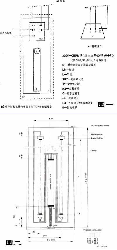 但是這又不具備可操作性,因為其一為惡劣情況的燈具是太嚴格了,實際測試中存在商用鎮(zhèn)流器在最差情形的燈具中不能通過某些試驗,而在實際燈具中能夠通過;其二為即使鎮(zhèn)流器在惡劣情況的燈具內(nèi)試驗通過了,仍遺留一個問題就是鎮(zhèn)流器內(nèi)裝在實際的燈具中不符合標準時的責(zé)任問題。為解決以上問題,使測試結(jié)果有一致性,目前國際上采用CISPR30:2001《Test method on electromagnetic emissions from electronic ballasts for single-and dou-ble—capped fluorescent lamps》。主要涉及到單端和雙端熒光燈用電子鎮(zhèn)流器,如圖2所示。