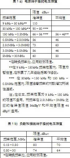 頻率范圍為150 kHz~30 MHz的負載和控制端子的騷擾電壓限值見表1 b)。