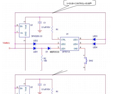 當(dāng)SW1和SW2閉合時,U1和U3均工作,主燈LED1~LED5點亮,此時通過LDO SPX5205提供3V電源來設(shè)置LED1的電流。