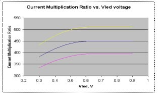 圖3:圖2電路的電流放大倍數(shù)與VLED電壓的關(guān)系。