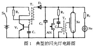 目前常用的閃光燈電路大多是高壓閃光燈電路,它由振蕩電路、升壓變壓器、儲(chǔ)能大電容器、高壓線圈、惰性氣體閃光燈組成,典型電路圖如圖1。