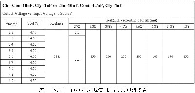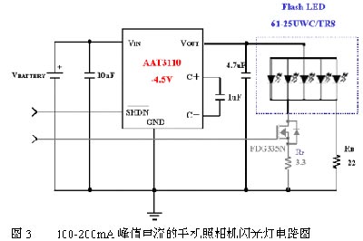 圖3是100-200mA峰值電流的手機(jī)照相機(jī)閃光燈電路圖,它用一顆AAT3110IGU-4.5V的電容式電荷泵,將手機(jī)鋰電池的電壓升壓并穩(wěn)壓至 4.5V,向一顆EL-61-25UWC Flash LED提供4.5V工作電壓、100-200mA峰值電流,F(xiàn)DG335N MOSFET作為閃光開關(guān),峰值電流經(jīng)它形成回路。電荷泵的輸入濾波電容器為10uF,輸出濾波電容器為4.7uF,儲(chǔ)能電容器為1uF,均選用等效串聯(lián)電阻(ESR)小的X7R、X5R陶瓷電容器。RB為Flash LED平衡電阻,RF為峰值電流調(diào)節(jié)電阻,改變這個(gè)電阻可以設(shè)定峰值電流的大小,見表1 AAT3110IGU-4.5V峰值Flash LED電流試驗(yàn)表所示。圖3為閃光前后Flash LED的電流變化圖。