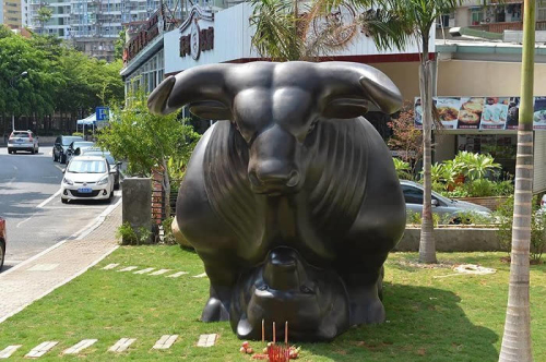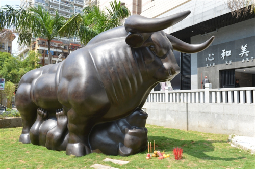 這是由廈門知名收藏家蔡銘超耗資百萬定制的一尊世上最大“牛壓熊”雕塑。這尊雕塑長6.1米,高3.4米,寬2.9米,重3噸多,采用銅材質(zhì)、鑄造工藝打造,造型是牛身下壓著一只熊。從雕塑外表看,牛和熊很容易讓人聯(lián)想起股市,而這正是制作者蔡銘超的意圖。他表示,這座雕塑寄托了廣大股民的希望:牛市永遠(yuǎn)強(qiáng)勁,熊市無法抬頭。
