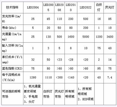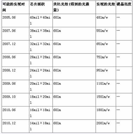 - LED芯片效率的提升將以階段性成長為主,從10lm/w~80lm/w、80lm/w~100lm/w、100lm/w~150lm/w、150lm/w~200lm/w…… 當(dāng)技術(shù)進(jìn)步到200lm/w時(shí)對比現(xiàn)有的芯片效率提升了4.5倍,芯片的發(fā)熱量將大幅度減少(指同體積同面積比較)