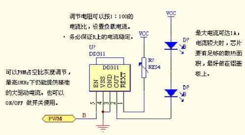 DD311 是一單通道輸出的LED恒流驅(qū)動(dòng)器,內(nèi)建電流鏡與電流開關(guān)組件,是專為驅(qū)動(dòng)大功率LED而設(shè)計(jì)的芯片.DD311可驅(qū)動(dòng)高達(dá)1安培的沈入電流(sink current),并可透過調(diào)整參考輸入電流(IREF)來任意設(shè)定輸出電流的大小.輸出電流值約為100倍的IREF,IREF可由調(diào)整外掛電阻或偏壓 (bias)電壓來設(shè)定.微調(diào)或使能偏壓電壓可校正LED間的亮度不一或?qū)崿F(xiàn)多顆LED間整體亮度同時(shí)調(diào)整.芯片的輸出端可承受高達(dá)36V的電壓,支持多顆大功率LED的串接應(yīng)用.內(nèi)建輸出使能端(Enable),可輕易地實(shí)現(xiàn)大功率LED的高灰階應(yīng)用。