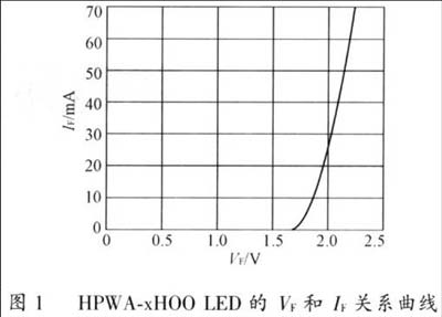 HPWA -xH00是Lumileds Lighting公司的一種超高亮LED,本文以它為例分析超高亮LED的特性.圖1為正向壓降(VF)和正向電流的(IF)關(guān)系曲線,由曲線可知,當(dāng)正向電壓超過某個(gè)閾值(約2V),即通常所說的導(dǎo)通電壓之后,可近似認(rèn)為,IF與VF成正比.表1是當(dāng)前主要超高亮LED的電氣特性.由表1可知,當(dāng)前超高亮LED的最高IF可達(dá)1A,而VF通常為3~4V.