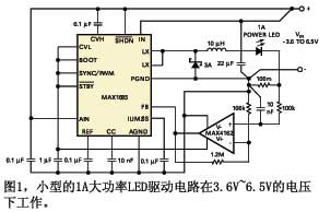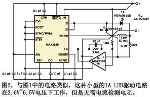 這些電路的設(shè)計者們采用相同的概念:全面集成的單芯IC開關(guān)穩(wěn)壓器和微功耗運算放大器。運算放大器驅(qū)動IC上的1.25V反饋端子。盡管該節(jié)點針對的是標準電壓穩(wěn)壓器的拓撲結(jié)構(gòu),運算放大器將其與小得多的電流檢測電壓及略有差異的電流調(diào)節(jié)器拓撲結(jié)構(gòu)相匹配。這些電路都不需要使用外部電源開關(guān)。由于不需要平滑處理LED電流中的高頻紋波,這種設(shè)計避免了開關(guān)穩(wěn)壓器中常用的較大值的濾波電容。所有電路的共同點是可以選擇變暗功能,方法是在運算放大器的輸入端引入可由電阻和電位器調(diào)節(jié)的偏置來實現(xiàn)。根據(jù)IC的不同,電阻及電位器可由內(nèi)部穩(wěn)壓器的VD或CVL端子來供電。