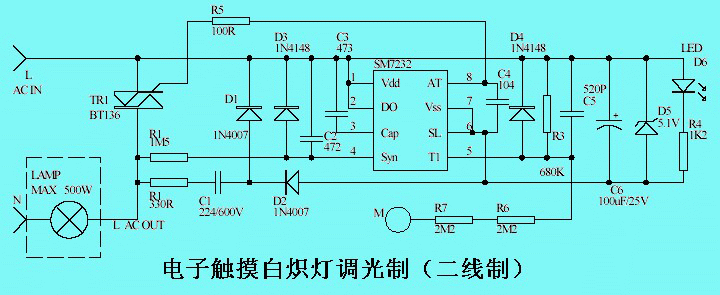 電路主要采用專門芯片SM7232制作而成,它通過人體觸摸M點觸摸片,控制白熾燈的開關(guān)和調(diào)光,最大負(fù)載功率達(dá)500W。 LED最好裝在觸摸片附近,在黑夜中起到指示的作用. R6、R7從人體保安考慮,有意采用2個電阻。 |