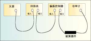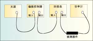 在圖一所示的測試系統(tǒng)中,測試光首先通過偏振控制器,然后經(jīng)過回波損耗儀,回波損耗儀的輸出端相當于測試的光輸出口。這里需要強調(diào)一點,由于偏振控制器有1~2dB插入損耗,回波損耗儀約有5dB插入損耗,所以此時輸出光與直接光源輸出光相比要小6~7dB。可以用兩根單端跳線分別接在回損儀和功率計上,采用熔接方式做測試參考,同樣可采用熔接方法將被測器件接入光路以測試器件的插損、偏振相關(guān)損耗(PDL)和回波損耗(ORL)。
