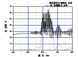 傳統(tǒng)MOCVD生長的紅黃光LED的外延結構中布拉格反射層(DBR Reflector)是很重要的部分。生產(chǎn)中MOCVD反應室條件是變化的,生長速度也會漂移。DBR反射層的反射峰值位置經(jīng)常會漂移,最方便的檢測手段為光學反射率的測量。因為GaP材料與空氣的折射率差很大,表層的反射率很大,這會與DBR層的反射產(chǎn)生干涉,使測試曲線變得復雜。如圖1,紅光LED全結構的反射率曲線,DBR的信息變得不是很清晰——附加了DBR層上面外延層的厚度信息。