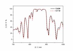 對于傳統(tǒng)紅黃光LED,這種厚度信息對DBR反射層信息的干擾也許可以忽略,但是對于RCLED影響卻相當大,以至于不能準確分析諧振腔的參數(shù)。一個實際RCLED結構中包含被稱為電流擴展層的厚層,我們根本無法確定光學凹陷的位置,如圖2,RCLED全結構的反射率曲線,兩個批次間隔20爐投片。