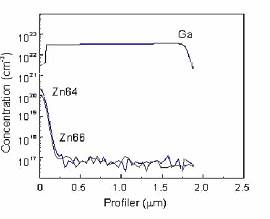 為了研究Zn層的厚度對(duì)摻雜濃度和深度的影響,取三個(gè)未摻雜顯n型的GaN樣品沉積不同厚度的Zn膜,分別為100nm、200nm、300nm。利用脈沖寬度為1.0ms的脈沖激光輻照樣品,輻照時(shí)間為2s。激光誘導(dǎo)摻雜完成后首先用稀HCl腐蝕掉樣品表面殘留的物質(zhì)。利用熱探針的方法測(cè)量樣品的p、n屬性,結(jié)果表明樣品的導(dǎo)電類(lèi)型都為p型,說(shuō)明激光誘導(dǎo)摻雜的方法成功地使得樣品發(fā)生了由n型向p型的轉(zhuǎn)變,利用電化學(xué)C-V方法進(jìn)行測(cè)量的結(jié)果也證實(shí)了這一點(diǎn)。圖1是我們用電化學(xué)C-V方法測(cè)量不同Zn薄膜厚度同樣摻雜方法的樣品所得到的空穴濃度分布圖。從圖1可以看到在接近樣品表面處空穴濃度最大達(dá)3×1018cm-3,然后空穴濃度隨深度的增加而按指數(shù)形式減少符合余誤差分布,100nm~300nm不同Zn厚度對(duì)摻雜的效果沒(méi)有影響,這可能是由于Zn的導(dǎo)熱性能很好,小范圍的厚度變化對(duì)于吸收激光后Zn/GaN界面的升溫沒(méi)有明顯影響。為了研究激光誘導(dǎo)摻雜樣品中摻入的Zn原子的分布情況,我們對(duì)另外一些試驗(yàn)條件的樣品進(jìn)行了SIMS(二次離子質(zhì)譜)分析。圖2是我們用脈沖寬度為1.5ms的Nd:YAG 輻照表面濺射Zn金屬薄膜的GaN樣品 ,用SIMS(二次離子質(zhì)譜)方法所測(cè)量該樣品中Zn64和Zn66(鋅的兩種同位素)的分布圖。從此圖可以看到在樣品表面Zn原子的濃度最大約5.63×1020cm-3,Zn原子的濃度隨深度的增加而按指數(shù)形式減少,也符合余誤差分布。從Zn在GaN樣品中的分布來(lái)看,激光誘導(dǎo)摻雜的分布和熱擴(kuò)散的分布比較類(lèi)似。因此,我們推測(cè)GaN表面激光誘導(dǎo)Zn摻雜的機(jī)理可能是Zn的熱擴(kuò)散。當(dāng)然影響激光誘導(dǎo)摻雜可能還有其他的一些因素,例如強(qiáng)激光照射金屬薄膜表面時(shí)可能會(huì)產(chǎn)生等離子體,從而引起等離子滲擴(kuò)效應(yīng)等等,這需要更多的理論和試驗(yàn)來(lái)證實(shí)。