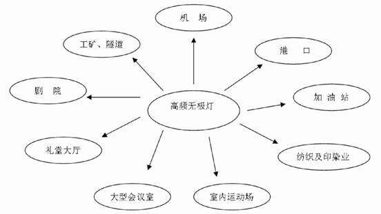 諾琦公司目前生產(chǎn)的主導(dǎo)產(chǎn)品高頻無極燈具有高效節(jié)能、高顯色性、壽命長等優(yōu)勢(shì)。在需要自然光線和不方便更換燈具的場(chǎng)合使用更為優(yōu)越。在使用中大大減少了維護(hù)費(fèi)用。按照目前的分類,可將其分為低壓氣體高頻無極燈、微波燈、環(huán)形日光燈式電磁感應(yīng)燈、HID高壓氣體無極放電燈四類。諾琦公司的主導(dǎo)產(chǎn)品主要應(yīng)用于以下圖示范圍中: