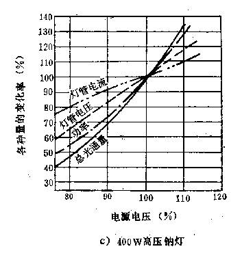由于氣體放電燈消耗的功率是和它的輸入電壓有關(guān)的,以鈉燈為例見(jiàn)圖c,當(dāng)電壓降低10%時(shí),電流降低10%,而此時(shí)功率降低達(dá)25%,光通量則降低30%。由于在設(shè)計(jì)道路照度時(shí)已考慮到正常的照度需要,所以不應(yīng)以降低照度來(lái)節(jié)約能源消耗。但考慮到在后半夜時(shí)車輛人流都大為減少,此時(shí)供電電壓由于用電負(fù)荷減少而升高,所以此時(shí)采用降低供電電壓而適當(dāng)降低光源的光通量也是可行的,假設(shè)在后半夜供電電壓升高10%,此時(shí)再降低供電電壓10%來(lái)運(yùn)行,則光通量減少為額定值70%,而消耗功率此時(shí)可減少50%。