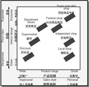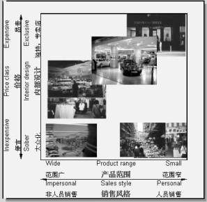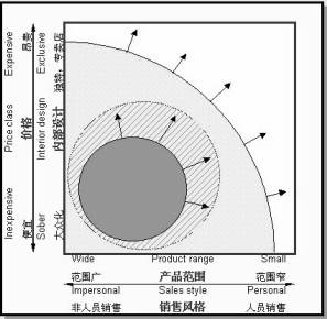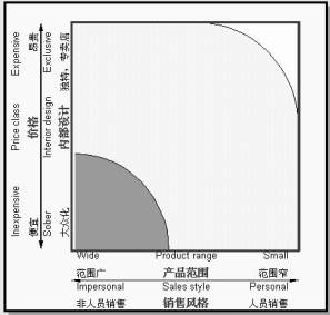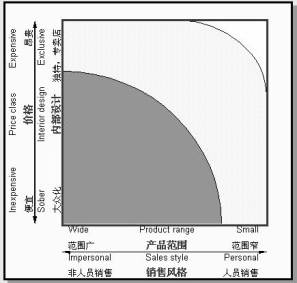 基于“四角理論”建立的市場(chǎng)細(xì)分模型—商店,使這四種類型的商店表現(xiàn)出各自鮮明的風(fēng)格、形象和個(gè)性特點(diǎn)。前兩種商店在顧客的概念中,是一種功能性很強(qiáng)的商店,以滿足基本的購物行為為典型特點(diǎn);后兩種尤其是高級(jí)品牌專賣店,突出的特征是時(shí)尚、高雅和精致的,滿足顧客想尋求時(shí)尚和刺激的心理,表現(xiàn)自己高雅的品味。