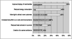 根據(jù)飛利浦照明對(duì)歐洲市場(chǎng)的調(diào)研,在所征詢的七個(gè)樣本中,零售商最關(guān)心的排在最前面的三個(gè)問題依次是:(1)通過照明改進(jìn)商品陳列的效果;(2)節(jié)能;(3)更多的光吸引更多的顧客。這個(gè)調(diào)研的結(jié)果和我們?cè)诘诙糠?ldquo;照明的具體功能”一節(jié)的論點(diǎn)是互為印證的。由此可見,零售商、商店也已充分意識(shí)到商店照明的重要性,它在商品銷售上的非直接的作用。