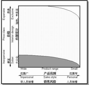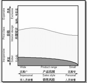 這個(gè)變化和趨勢(shì)的結(jié)果,就是重新劃分了商店類型。根據(jù)飛利浦照明在歐洲和中國市場(chǎng)的調(diào)研,以價(jià)格水平(Price class)、內(nèi)部設(shè)計(jì)(Interior design)、產(chǎn)品范圍(Product range)和銷售風(fēng)格(Selling style)四個(gè)主要變量為依據(jù),并歸納為“四角理論”,把商店概括為四個(gè)主要類別。由低檔到高檔分別是:(1)價(jià)格便宜、商品陳列簡單、帶社區(qū)服務(wù)特點(diǎn)的商店;(2)價(jià)格較便宜、商品陳列多、自助式服務(wù)的商店;(3)有一定檔次的、價(jià)格較貴、講究商品陳列和質(zhì)量、注重店鋪的裝飾性,購物是一種享受的商店;(4)商品檔次高價(jià)格貴的頂級(jí)商品專賣店(Super specialist shop),它具有獨(dú)特的講究風(fēng)格的環(huán)境和高水平的服務(wù),提供最頂尖和奢侈的商品。如Gucci、Zegna、Fendi、Diro、Cartier等世界頂級(jí)時(shí)裝和奢侈品專賣店。