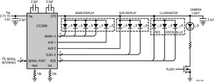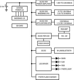 從圖1所示的方框圖中很容易理解,功能越多就需要在不同的功率級有更多的低壓輸出軌。而且,為多個(gè)顯示屏提供背光照明以及驅(qū)動多種“指示”燈的需求也在增加。例如,手機(jī)具有一個(gè)主顯示器以用來觀看文本、圖形或照片,一個(gè)副顯示器來顯示時(shí)間、日期或來電號碼,一個(gè)用作照相機(jī)閃光燈或?yàn)橐曨l捕捉而置于手電筒模式的白光LED,以及一個(gè)照相機(jī)在使用時(shí)發(fā)出紅光的LED,這種情況并不罕見。