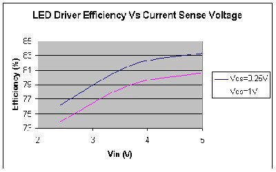 圖3:LED驅(qū)動(dòng)器效率顯示了電流檢測(cè)電阻器損耗的重要性