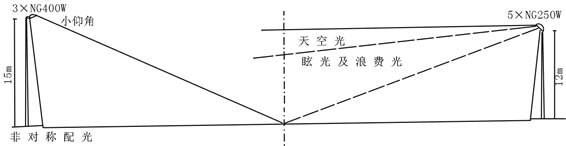 路燈的安裝仰角也是影響眩光指標(biāo)的一個重要因素。CIE規(guī)定路燈的仰角不能大于5,其主要目的就是限制眩光。我國有關(guān)規(guī)定路燈的安裝仰角在15以內(nèi),主要是受經(jīng)濟(jì)條件制約,為了降低燈高,節(jié)省造價,當(dāng)在寬闊路面布燈時,許多建設(shè)單位為了增加燈具的橫向照射距離,往往不是增加燈桿高度,而是隨意增加燈具的仰角,造成不必要的眩光污染。實(shí)驗(yàn)表明,增加仰角對路面亮度并無質(zhì)的增長。而增加燈高、增大單燈功率并加大燈間距,即可保證照度及均勻度,又可減小仰角,限制眩光,同時由于用燈數(shù)量減少,造價并不增加。