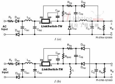 圖1所示為配置為基本降壓式轉(zhuǎn)換器(圖1a)和基本升降壓式轉(zhuǎn)換器(圖1b)的LinkSwitch-TN器件。通過在單片IC上集成一個功率MOSFET、振蕩器、簡單的開/關(guān)控制、一個高壓開關(guān)電流源、頻率抖動、逐周期電流限流及熱關(guān)斷電路,可以簡化轉(zhuǎn)換器階段的設(shè)計(jì)復(fù)雜度并減少元件數(shù)。LinkSwitch-TN器件可通過漏極引腳實(shí)現(xiàn)自供電,無需使用偏置電源及相關(guān)電路。它極具成本效益,可用來替代輸出電流小于或等于360mA的線性和電容降壓式非隔離電源,因此能夠提供出色的輸入電壓調(diào)整率和負(fù)載調(diào)整率。與無源元件電源方案相比,它的效率更高,而功率因子則比電容降壓式方案高。