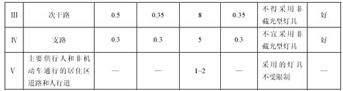 注:1、表中所列的平均照度僅適用于瀝青路面,若系水泥混凝土路面,其平均照度值可相應降低 20~30%。