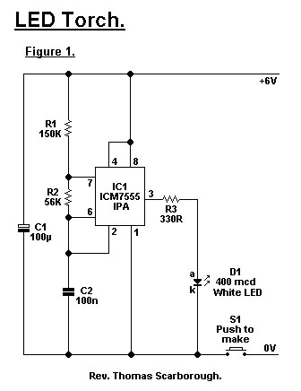 LED手電筒的核心是一個(gè)7555時(shí)基集成電路(不能使用普通的555)。一個(gè)白色的發(fā)光二極管(如果你找不到,只能用別的顏色代替)工作時(shí)發(fā)出的亮度大約為400mcd,這樣當(dāng)聚焦時(shí),可照亮30米遠(yuǎn)的物體。