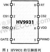 HV993l采用8引腳SOIC和DIP封裝,引腳排列如圖1所示。引腳功能如表1所列。