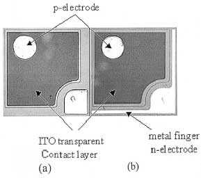 在LED芯片的制作過(guò)程中,要想得到光電性能良好的芯片,首要條件就是有一個(gè)合理的圖形設(shè)計(jì),因?yàn)樗鼪Q定了電流擴(kuò)展的情況,只有均勻擴(kuò)展的結(jié)構(gòu)才有著良好的穩(wěn)定性。電流的均勻擴(kuò)展能夠避免對(duì)局部注入的電流相對(duì)過(guò)大而使那一點(diǎn)處的結(jié)溫局部過(guò)高致使p-n結(jié)燒毀,這對(duì)于工作電流較高的功率型芯片尤為重要。因此,要想得到好的穩(wěn)定性就要先有一個(gè)合理的圖形結(jié)構(gòu)。