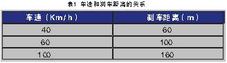 上圖的剎車距離是發(fā)現障礙物到剎車停止的距離,通常與車速有關,具體數據如表1所示。