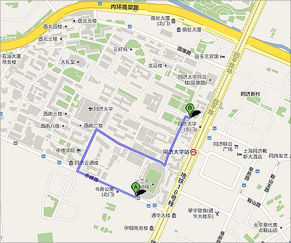 地點(diǎn):上海市楊浦區(qū)四平路1239號同濟(jì)大學(xué)本部校區(qū) 逸夫樓一樓 步行:學(xué)校正門(東門)進(jìn)入,電子屏幕路口左轉(zhuǎn)即到(見下圖白色建筑) 地鐵:10號線同濟(jì)大學(xué)站可到學(xué)校正門 自駕車:最近同濟(jì)大學(xué)國康路校門車無法進(jìn)入,所有車輛都停在赤峰路18號停車場(靠近校南門,即赤峰路校門)。 下圖為從停車場到會場逸夫樓的步行路線圖。圖中A為停車場,B為逸夫樓。