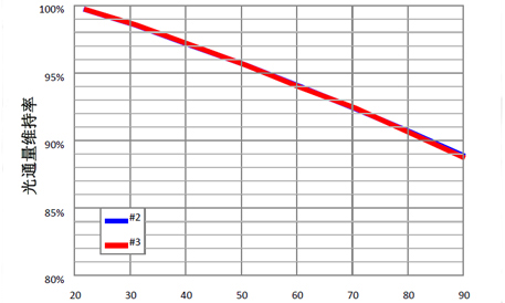 老化條件為 85℃&85%RH,老化過(guò)程中樣品以 540mA 電流點(diǎn)亮,分別 在 0h、168h 和 336h 進(jìn)行光色電性能測(cè)試,其光通量維持率如圖 7 所示。