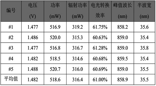 隨機選取的5顆樣品在350mA電流狀態(tài)下,輸出的平均輻射功率為 316.4mW,電光轉(zhuǎn)換效率為 61.00%,平均峰值波長為 858.9 nm,半波寬為35.5nm。