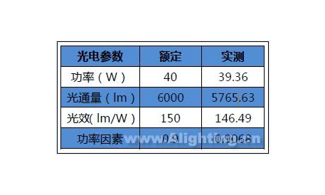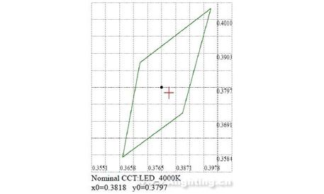 傳統(tǒng)的LED照明由于芯片的因素決定了高光效的芯片,色溫上會偏高,往往為了達到整燈的高光效、照度達到要求而會舍棄色溫上的適應性。不過,隨著越來越多的用戶注重現(xiàn)場照明效果從人的需求出發(fā),需求在不同性質、不同等級的道路或環(huán)境相對應的有供選擇最佳色溫區(qū)間。比較合適的色溫是4000~5000K左右,這時視覺比較舒適,同時光效較高。這款樣品的額定色溫為4000K,實測色溫為3899K,在保證樣品高光效同時,也選擇了一個讓人更為舒適的色溫區(qū)間。