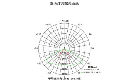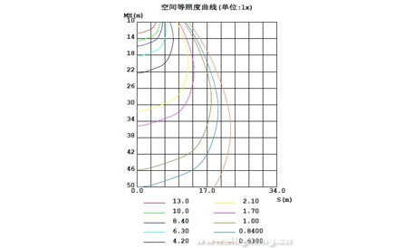 從配光曲線圖可看出,這款樣品采用了蝙蝠翼型配光,C0/180面為73.5度,C90/270面為134.5度,平均光束角為104度,結合空間等照度曲線,考察的是該燈具下10m到50m,距離34m的截面(C0平面)的照度分布情況。