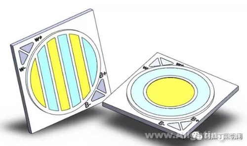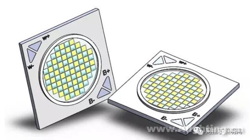 可調(diào)色COB光源通常是由兩種或以上不同顏色芯片線(xiàn)路組成,分別調(diào)控兩組顏色亮度比例,通過(guò)混光來(lái)實(shí)現(xiàn)整個(gè)COB光源出光顏色的變化,其技術(shù)難點(diǎn)是混光效果。早期類(lèi)似結(jié)構(gòu)的COB光源很多,只是遠(yuǎn)沒(méi)有達(dá)到商業(yè)照明要求而無(wú)法應(yīng)用。