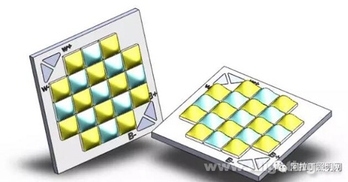 將COB光源劃成若干發(fā)光區(qū)域,填充兩組或多組不同顏色的熒光粉,亮某部分區(qū)域是3000K,另外區(qū)域亮是6000K,同時(shí)亮,貌似4000K,貌似,呵呵。