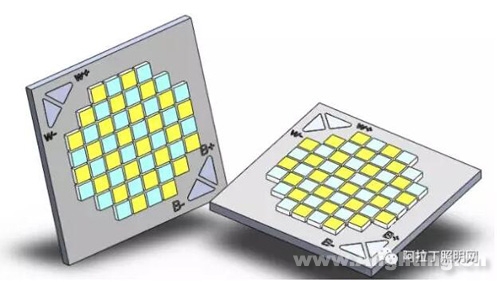 將兩組顏色的高功率3030貼片SMD挨個(gè)排好,想怎么排就怎么排,反正沒(méi)封裝廠(chǎng)什么事,3W流明密度不夠就用5W一顆。調(diào)控兩路顏色亮度比例就可實(shí)現(xiàn)調(diào)光色。