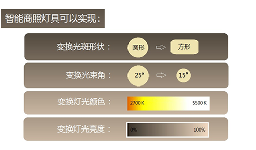 當(dāng)然智能商業(yè)照明燈具不僅僅是調(diào)光調(diào)色,根據(jù)物體形狀變化實(shí)現(xiàn)燈具光束角及光斑形狀的相應(yīng)調(diào)整亦是其重要內(nèi)容。