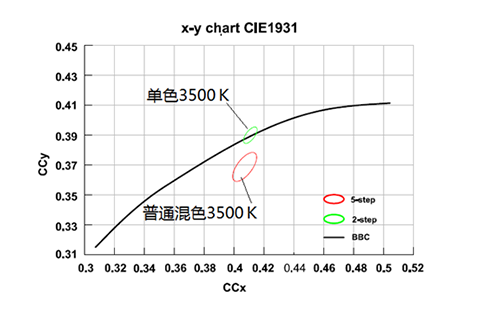 與單色COB光源相比,光色坐標(biāo)有較大偏差。
